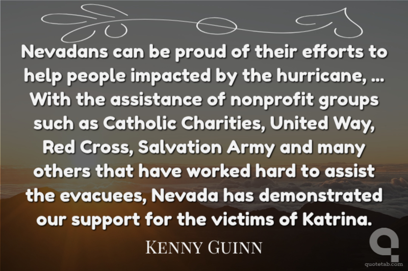Nevadans can be proud of their efforts to help people impacted by the hurricane, ... With the assistance of nonprofit groups such as Catholic Charities, United Way, Red Cross, Salvation Army and many others that have worked hard to assist the evacuees, Nevada has demonstrated our support for the victims of Katrina.