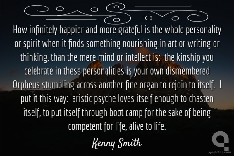 How infinitely happier and more grateful is the whole personality or spirit when it finds something nourishing in art or writing or thinking, than the mere mind or intellect is: the kinship you celebrate in these personalities is your own dismembered Orpheus stumbling across another fine organ to rejoin to itself. I put it this way: aristic psyche loves itself enough to chasten itself, to put itself through boot camp for the sake of being competent for life, alive to life.