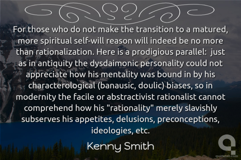 For those who do not make the transition to a matured, more spiritual self-will reason will indeed be no more than rationalization. Here is a prodigious parallel: just as in antiquity the dysdaimonic personality could not appreciate how his mentality was bound in by his characterological (banausic, doulic) biases, so in modernity the facile or abstractivist rationalist cannot comprehend how his "rationality" merely slavishly subserves his appetites, delusions, preconceptions, ideologies, etc.