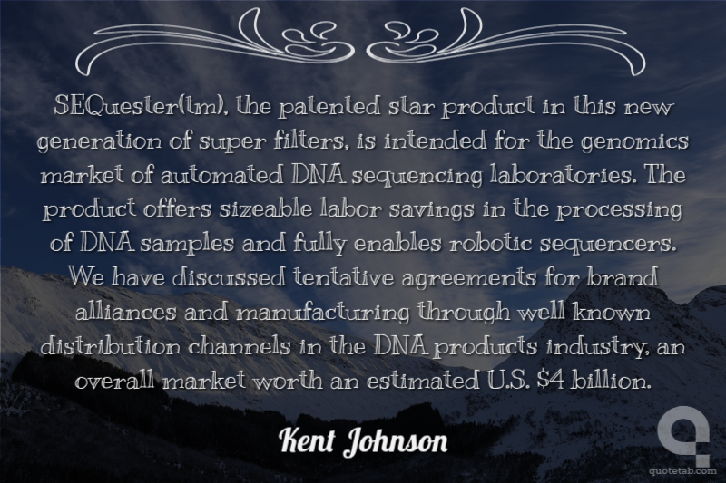 SEQuester(tm), the patented star product in this new generation of super filters, is intended for the genomics market of automated DNA sequencing laboratories. The product offers sizeable labor savings in the processing of DNA samples and fully enables robotic sequencers. We have discussed tentative agreements for brand alliances and manufacturing through well known distribution channels in the DNA products industry, an overall market worth an estimated U.S. $4 billion.