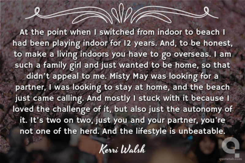 At the point when I switched from indoor to beach I had been playing indoor for 12 years. And, to be honest, to make a living indoors you have to go overseas. I am such a family girl and just wanted to be home, so that didn't appeal to me. Misty May was looking for a partner, I was looking to stay at home, and the beach just came calling. And mostly I stuck with it because I loved the challenge of it, but also just the autonomy of it. It's two on two, just you and your partner, you're not one of the herd. And the lifestyle is unbeatable.
