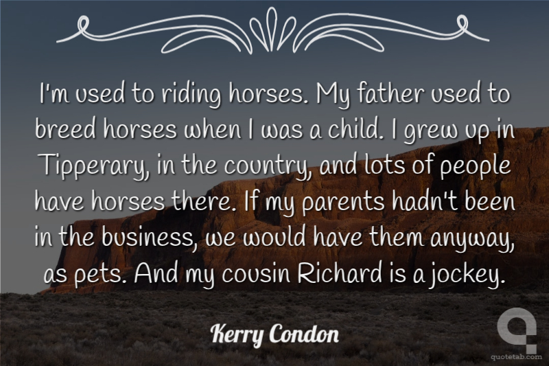 I'm used to riding horses. My father used to breed horses when I was a child. I grew up in Tipperary, in the country, and lots of people have horses there. If my parents hadn't been in the business, we would have them anyway, as pets. And my cousin Richard is a jockey.