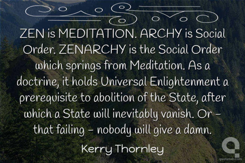 ZEN is MEDITATION. ARCHY is Social Order. ZENARCHY is the Social Order which springs from Meditation. As a doctrine, it holds Universal Enlightenment a prerequisite to abolition of the State, after which a State will inevitably vanish. Or - that failing - nobody will give a damn.