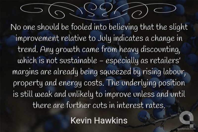 No one should be fooled into believing that the slight improvement relative to July indicates a change in trend. Any growth came from heavy discounting, which is not sustainable - especially as retailers' margins are already being squeezed by rising labour, property and energy costs. The underlying position is still weak and unlikely to improve unless and until there are further cuts in interest rates.