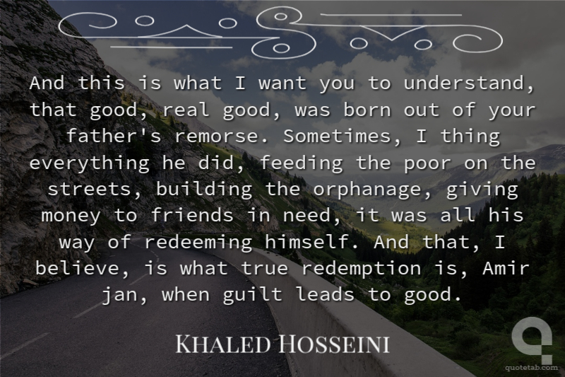 And this is what I want you to understand, that good, real good, was born out of your father's remorse. Sometimes, I thing everything he did, feeding the poor on the streets, building the orphanage, giving money to friends in need, it was all his way of redeeming himself. And that, I believe, is what true redemption is, Amir jan, when guilt leads to good.