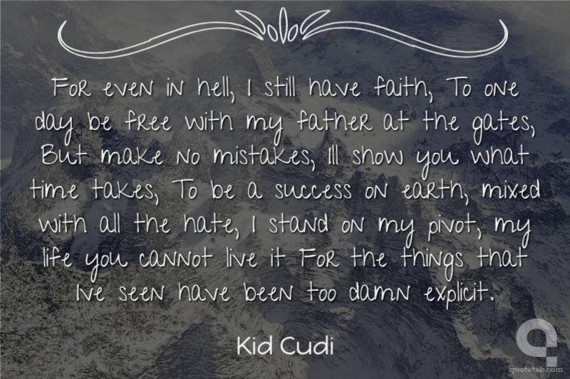 For even in hell, I still have faith, To one day be free with my father at the gates, But make no mistakes, Ill show you what time takes, To be a success on earth, mixed with all the hate, I stand on my pivot, my life you cannot live it For the things that Ive seen have been too damn explicit.