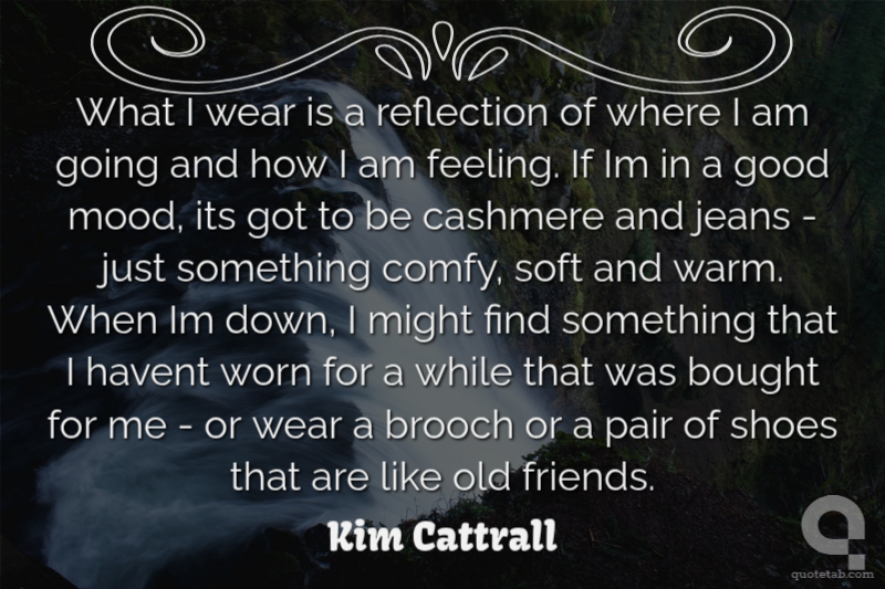 What I wear is a reflection of where I am going and how I am feeling. If Im in a good mood, its got to be cashmere and jeans - just something comfy, soft and warm. When Im down, I might find something that I havent worn for a while that was bought for me - or wear a brooch or a pair of shoes that are like old friends.