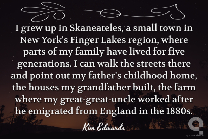 I grew up in Skaneateles, a small town in New York's Finger Lakes region, where parts of my family have lived for five generations. I can walk the streets there and point out my father's childhood home, the houses my grandfather built, the farm where my great-great-uncle worked after he emigrated from England in the 1880s.