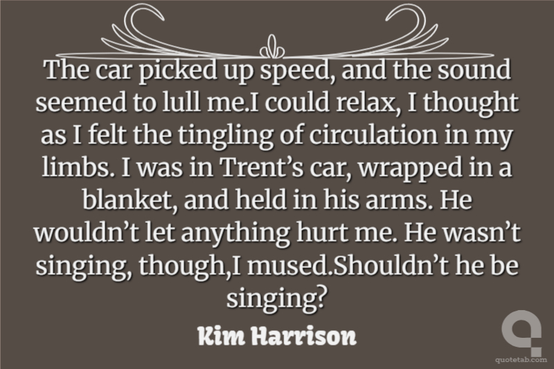 The car picked up speed, and the sound seemed to lull me.I could relax, I thought as I felt the tingling of circulation in my limbs. I was in Trent’s car, wrapped in a blanket, and held in his arms. He wouldn’t let anything hurt me. He wasn’t singing, though,I mused.Shouldn’t he be singing?