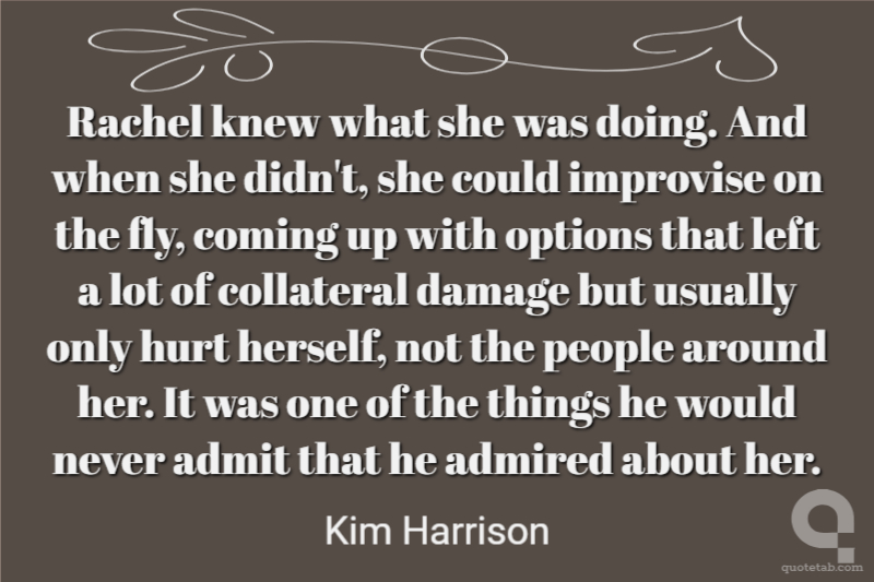 Rachel knew what she was doing. And when she didn't, she could improvise on the fly, coming up with options that left a lot of collateral damage but usually only hurt herself, not the people around her. It was one of the things he would never admit that he admired about her.