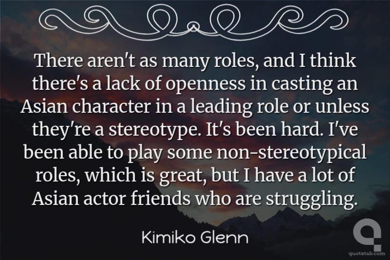 There aren't as many roles, and I think there's a lack of openness in casting an Asian character in a leading role or unless they're a stereotype. It's been hard. I've been able to play some non-stereotypical roles, which is great, but I have a lot of Asian actor friends who are struggling.