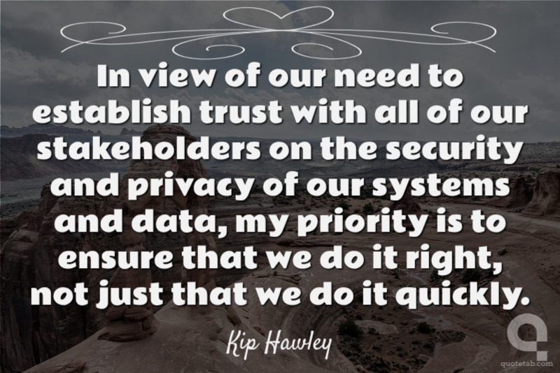 In view of our need to establish trust with all of our stakeholders on the security and privacy of our systems and data, my priority is to ensure that we do it right, not just that we do it quickly.