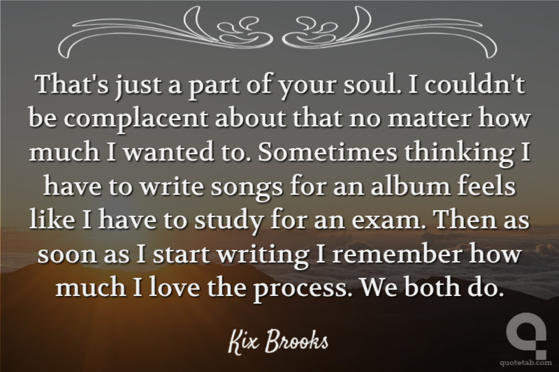 That's just a part of your soul. I couldn't be complacent about that no matter how much I wanted to. Sometimes thinking I have to write songs for an album feels like I have to study for an exam. Then as soon as I start writing I remember how much I love the process. We both do.