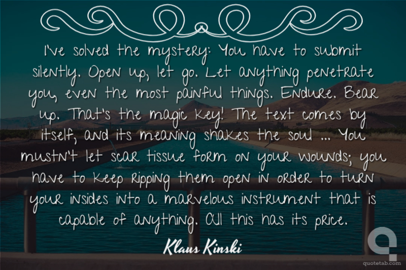 I've solved the mystery: You have to submit silently. Open up, let go. Let anything penetrate you, even the most painful things. Endure. Bear up. That's the magic key! The text comes by itself, and its meaning shakes the soul ... You mustn't let scar tissue form on your wounds; you have to keep ripping them open in order to turn your insides into a marvelous instrument that is capable of anything. All this has its price.