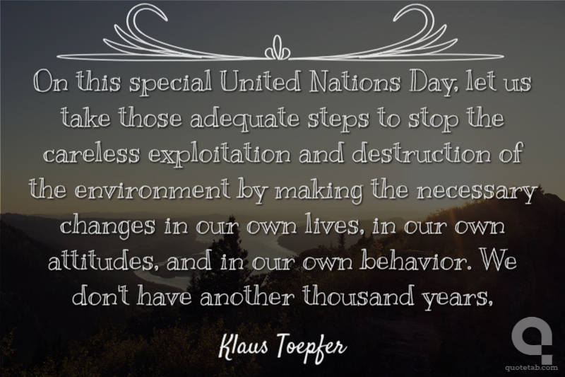 On this special United Nations Day, let us take those adequate steps to stop the careless exploitation and destruction of the environment by making the necessary changes in our own lives, in our own attitudes, and in our own behavior. We don't have another thousand years,