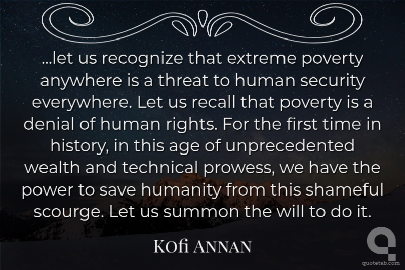 ...let us recognize that extreme poverty anywhere is a threat to human security everywhere. Let us recall that poverty is a denial of human rights. For the first time in history, in this age of unprecedented wealth and technical prowess, we have the power to save humanity from this shameful scourge. Let us summon the will to do it.