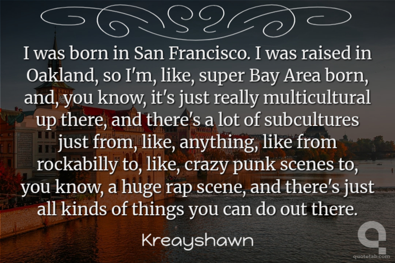 I was born in San Francisco. I was raised in Oakland, so I'm, like, super Bay Area born, and, you know, it's just really multicultural up there, and there's a lot of subcultures just from, like, anything, like from rockabilly to, like, crazy punk scenes to, you know, a huge rap scene, and there's just all kinds of things you can do out there.