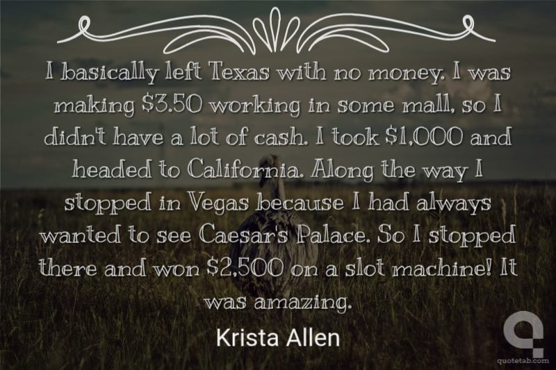 I basically left Texas with no money. I was making $3.50 working in some mall, so I didn't have a lot of cash. I took $1,000 and headed to California. Along the way I stopped in Vegas because I had always wanted to see Caesar's Palace. So I stopped there and won $2,500 on a slot machine! It was amazing.