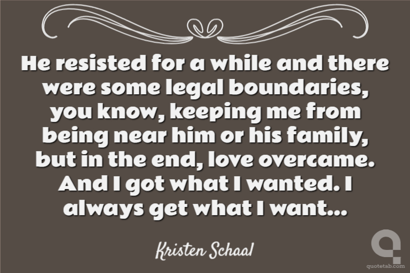 He resisted for a while and there were some legal boundaries, you know, keeping me from being near him or his family, but in the end, love overcame. And I got what I wanted. I always get what I want...