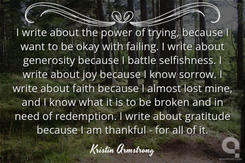 I write about the power of trying, because I want to be okay with failing. I write about generosity because I battle selfishness. I write about joy because I know sorrow. I write about faith because I almost lost mine, and I know what it is to be broken and in need of redemption. I write about gratitude because I am thankful - for all of it.