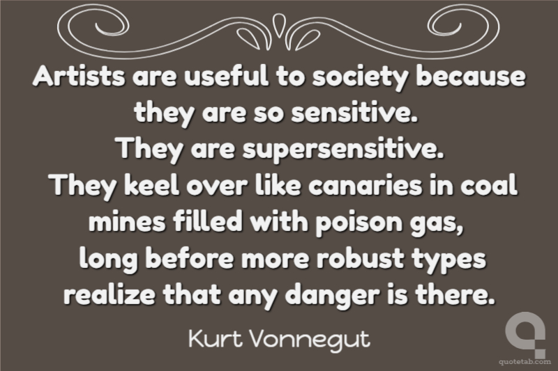 Artists are useful to society because they are so sensitive. They are supersensitive. They keel over like canaries in coal mines filled with poison gas, long before more robust types realize that any danger is there.