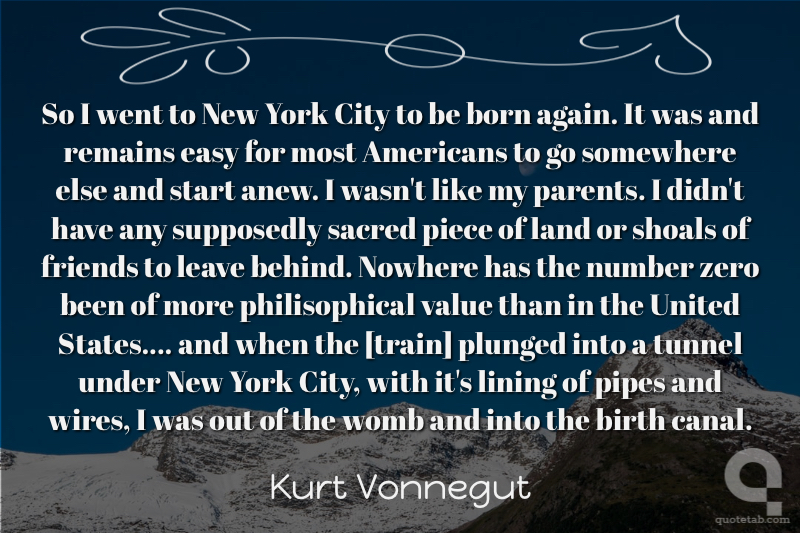 So I went to New York City to be born again. It was and remains easy for most Americans to go somewhere else and start anew. I wasn't like my parents. I didn't have any supposedly sacred piece of land or shoals of friends to leave behind. Nowhere has the number zero been of more philisophical value than in the United States.... and when the [train] plunged into a tunnel under New York City, with it's lining of pipes and wires, I was out of the womb and into the birth canal.