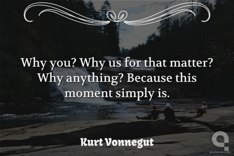 - Why me? - That is a very Earthling question to ask, Mr. Pilgrim. Why you? Why us for that matter? Why anything? Because this moment simply is. Have you ever seen bugs trapped in amber? - Yes. - Well, here we are, Mr. Pilgrim, trapped in the amber of this moment. There is no why.