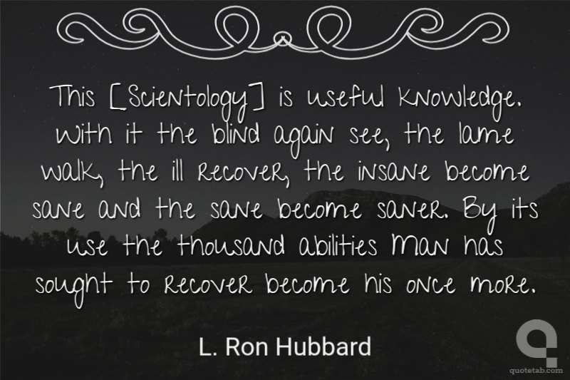 This [Scientology] is useful knowledge. With it the blind again see, the lame walk, the ill recover, the insane become sane and the sane become saner. By its use the thousand abilities Man has sought to recover become his once more.