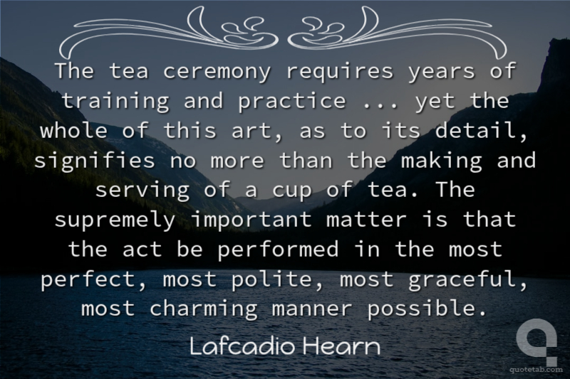 The tea ceremony requires years of training and practice ... yet the whole of this art, as to its detail, signifies no more than the making and serving of a cup of tea. The supremely important matter is that the act be performed in the most perfect, most polite, most graceful, most charming manner possible.