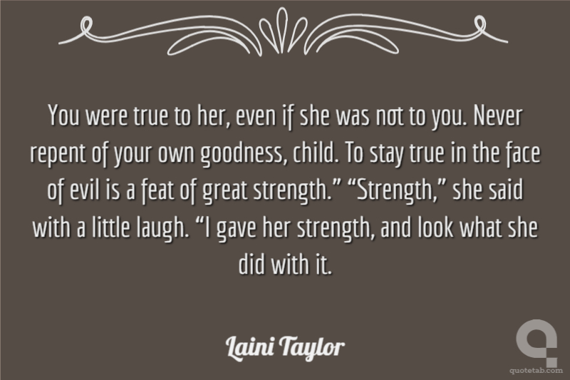 You were true to her, even if she was not to you. Never repent of your own goodness, child. To stay true in the face of evil is a feat of great strength.” “Strength,” she said with a little laugh. “I gave her strength, and look what she did with it.