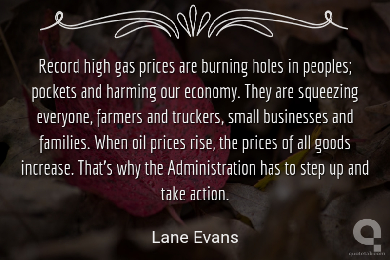 Record high gas prices are burning holes in peoples; pockets and harming our economy. They are squeezing everyone, farmers and truckers, small businesses and families. When oil prices rise, the prices of all goods increase. That's why the Administration has to step up and take action.