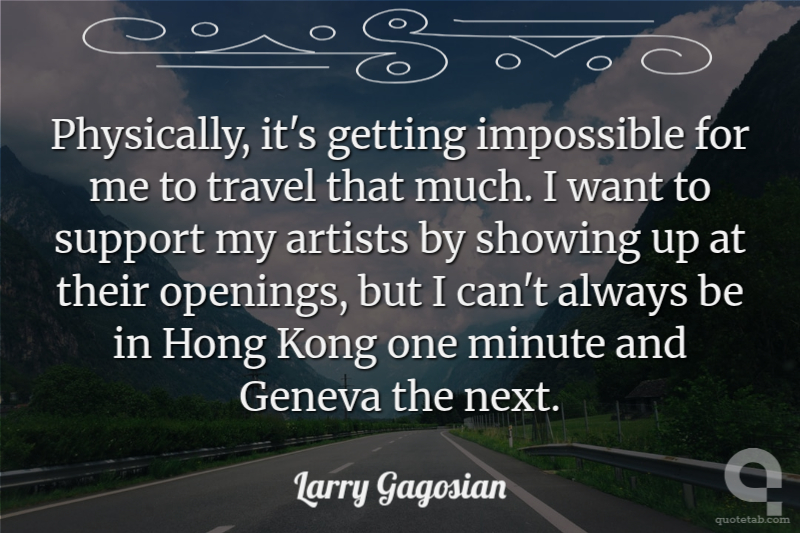 Physically, it's getting impossible for me to travel that much. I want to support my artists by showing up at their openings, but I can't always be in Hong Kong one minute and Geneva the next.