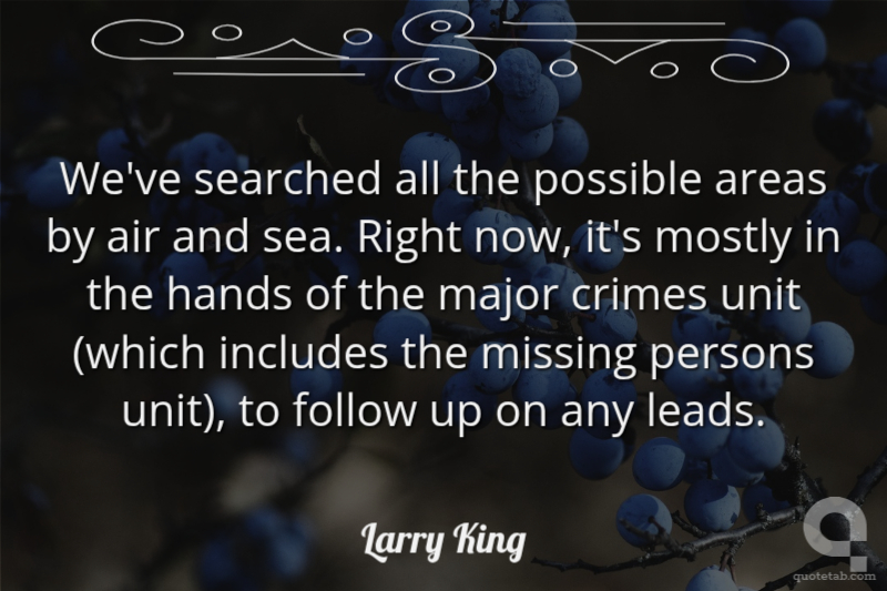 We've searched all the possible areas by air and sea. Right now, it's mostly in the hands of the major crimes unit (which includes the missing persons unit), to follow up on any leads.