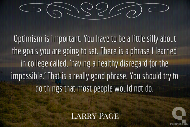 Optimism is important. You have to be a little silly about the goals you are going to set. There is a phrase I learned in college called, 'having a healthy disregard for the impossible.' That is a really good phrase. You should try to do things that most people would not do.