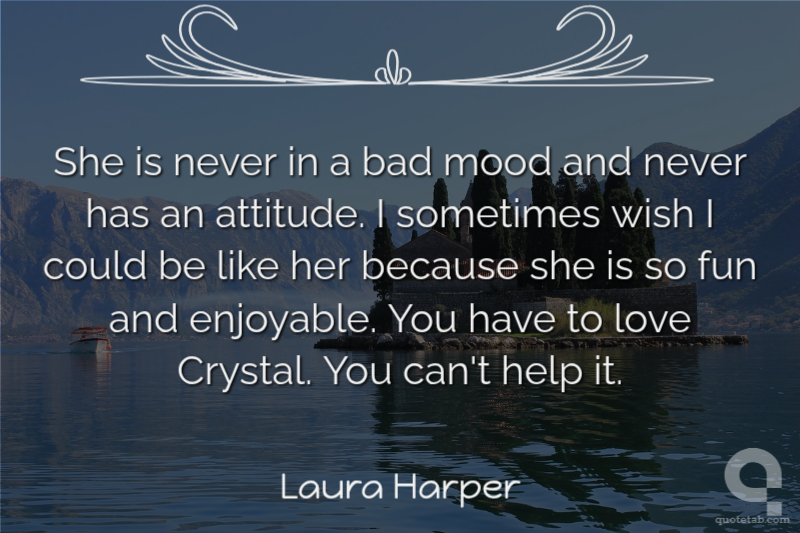She is never in a bad mood and never has an attitude. I sometimes wish I could be like her because she is so fun and enjoyable. You have to love Crystal. You can't help it.