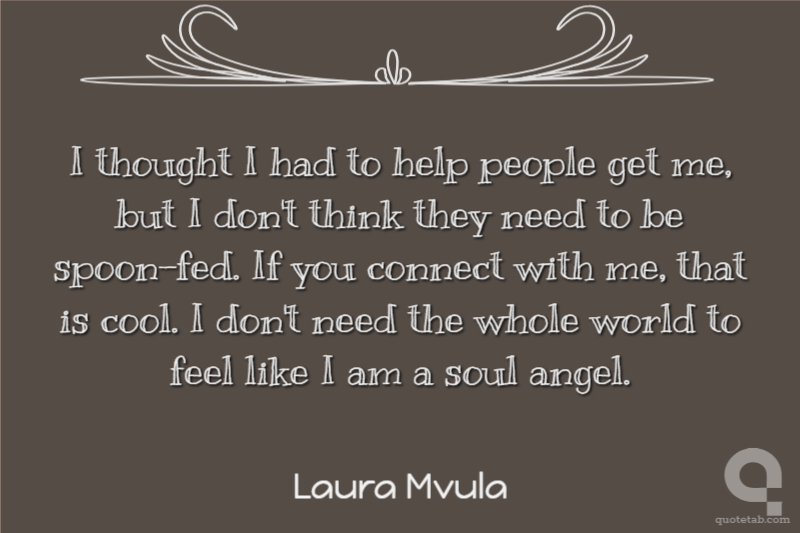 I thought I had to help people get me, but I don't think they need to be spoon-fed. If you connect with me, that is cool. I don't need the whole world to feel like I am a soul angel.