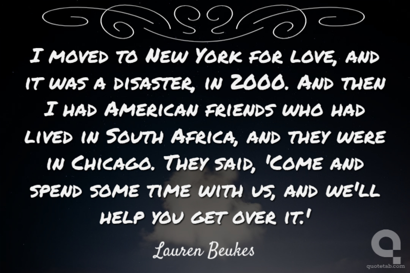 I moved to New York for love, and it was a disaster, in 2000. And then I had American friends who had lived in South Africa, and they were in Chicago. They said, 'Come and spend some time with us, and we'll help you get over it.'