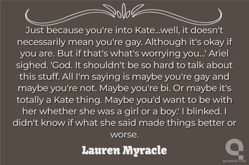 Just because you're into Kate...well, it doesn't necessarily mean you're gay. Although it's okay if you are. But if that's what's worrying you...' Ariel sighed. 'God. It shouldn't be so hard to talk about this stuff. All I'm saying is maybe you're gay and maybe you're not. Maybe you're bi. Or maybe it's totally a Kate thing. Maybe you'd want to be with her whether she was a girl or a boy.' I blinked. I didn't know if what she said made things better or worse.