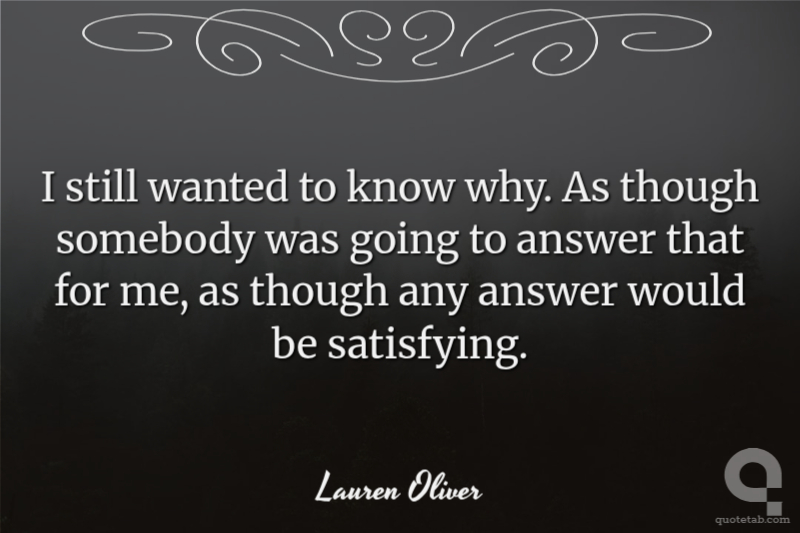 I still wanted to know why. As though somebody was going to answer that for me, as though any answer would be satisfying.