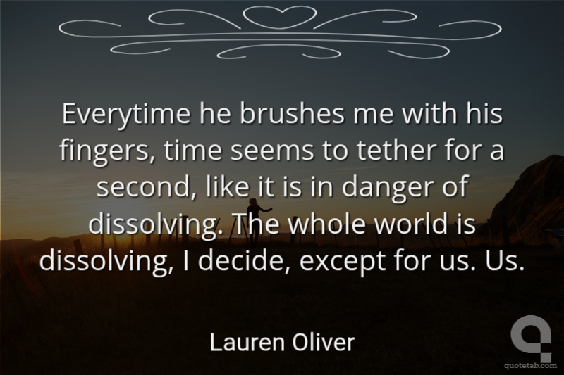 Everytime he brushes me with his fingers, time seems to tether for a second, like it is in danger of dissolving. The whole world is dissolving, I decide, except for us. Us.