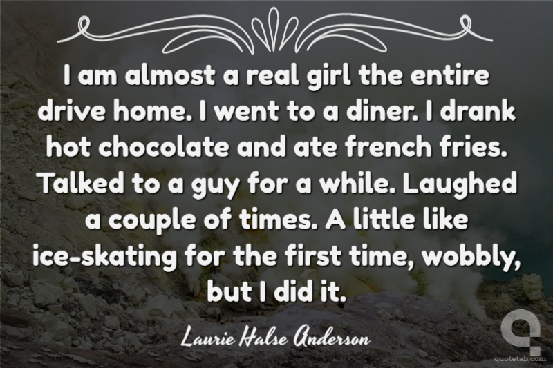 I am almost a real girl the entire drive home. I went to a diner. I drank hot chocolate and ate french fries. Talked to a guy for a while. Laughed a couple of times. A little like ice-skating for the first time, wobbly, but I did it.