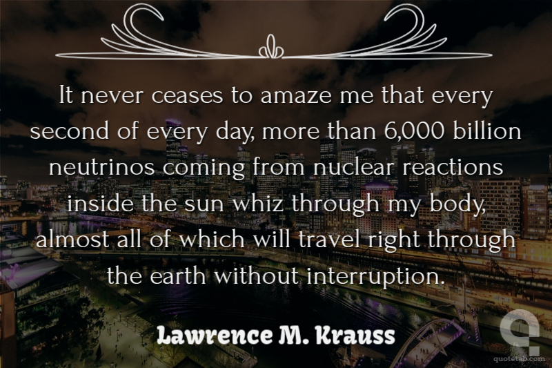It never ceases to amaze me that every second of every day, more than 6,000 billion neutrinos coming from nuclear reactions inside the sun whiz through my body, almost all of which will travel right through the earth without interruption.