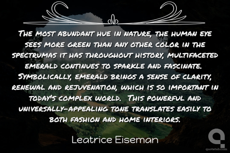 The most abundant hue in nature, the human eye sees more green than any other color in the spectrumas it has throughout history, multifaceted emerald continues to sparkle and fascinate. Symbolically, emerald brings a sense of clarity, renewal and rejuvenation, which is so important in today's complex world. This powerful and universally-appealing tone translates easily to both fashion and home interiors.