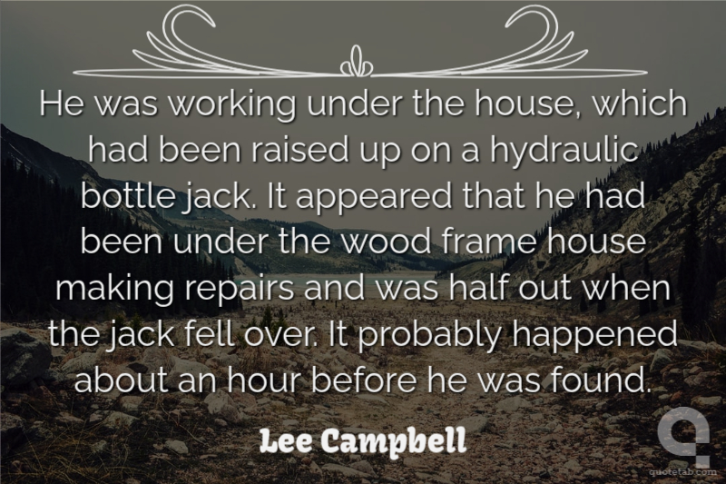 He was working under the house, which had been raised up on a hydraulic bottle jack. It appeared that he had been under the wood frame house making repairs and was half out when the jack fell over. It probably happened about an hour before he was found.