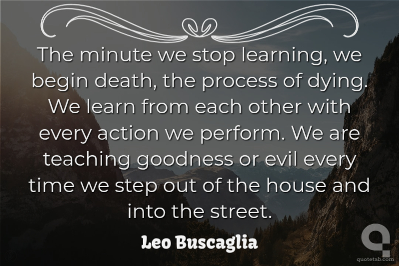 The minute we stop learning, we begin death, the process of dying. We learn from each other with every action we perform. We are teaching goodness or evil every time we step out of the house and into the street.