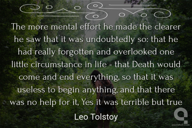The more mental effort he made the clearer he saw that it was undoubtedly so: that he had really forgotten and overlooked one little circumstance in life - that Death would come and end everything, so that it was useless to begin anything, and that there was no help for it, Yes it was terrible but true