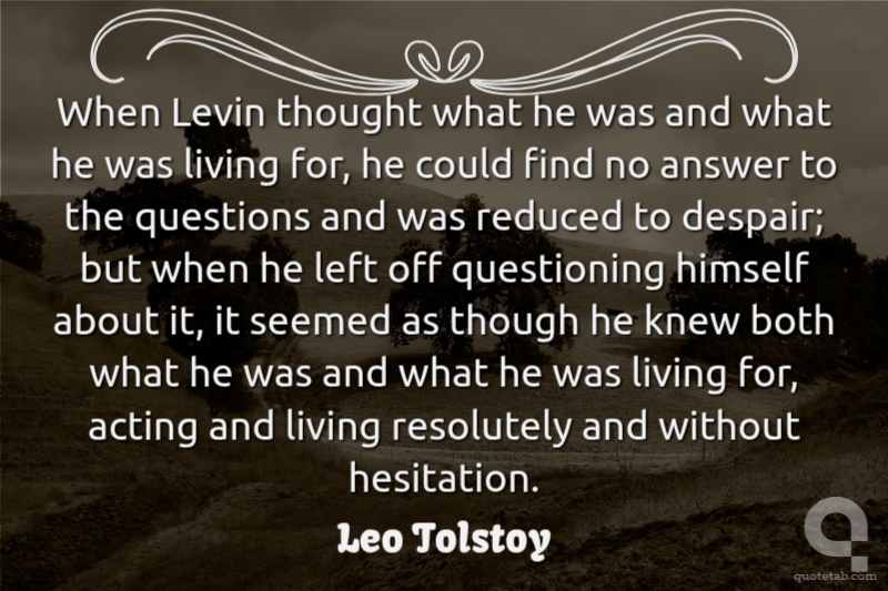 When Levin thought what he was and what he was living for, he could find no answer to the questions and was reduced to despair; but when he left off questioning himself about it, it seemed as though he knew both what he was and what he was living for, acting and living resolutely and without hesitation.