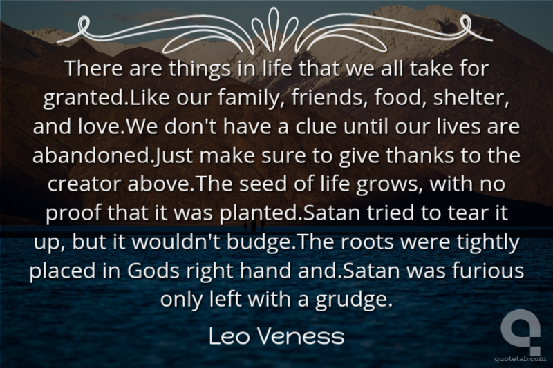 There are things in life that we all take for granted.Like our family, friends, food, shelter, and love.We don't have a clue until our lives are abandoned.Just make sure to give thanks to the creator above.The seed of life grows, with no proof that it was planted.Satan tried to tear it up, but it wouldn't budge.The roots were tightly placed in Gods right hand and.Satan was furious only left with a grudge.