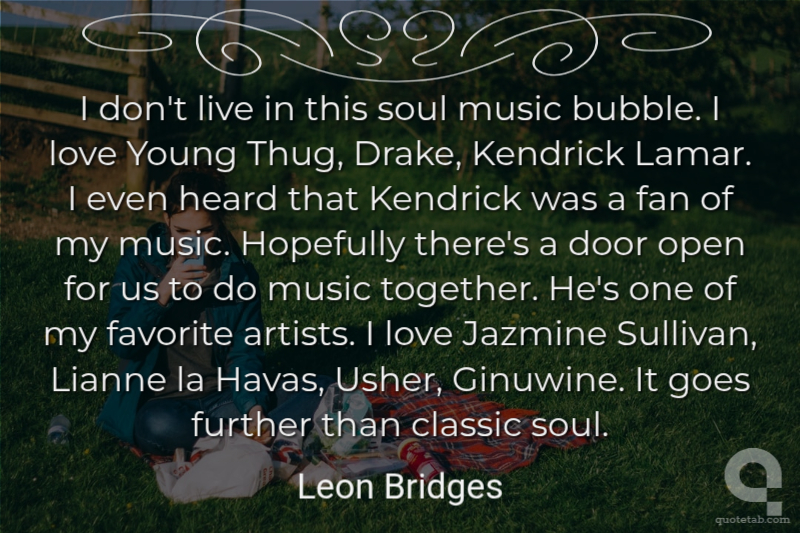 I don't live in this soul music bubble. I love Young Thug, Drake, Kendrick Lamar. I even heard that Kendrick was a fan of my music. Hopefully there's a door open for us to do music together. He's one of my favorite artists. I love Jazmine Sullivan, Lianne la Havas, Usher, Ginuwine. It goes further than classic soul.