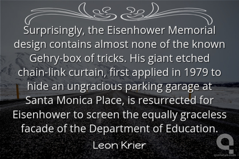 Surprisingly, the Eisenhower Memorial design contains almost none of the known Gehry-box of tricks. His giant etched chain-link curtain, first applied in 1979 to hide an ungracious parking garage at Santa Monica Place, is resurrected for Eisenhower to screen the equally graceless facade of the Department of Education.